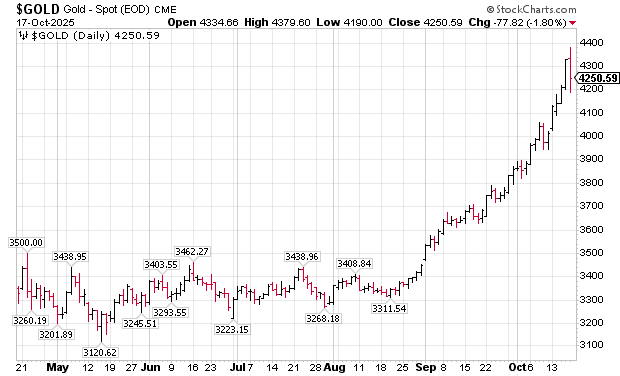 Gold and silver were again front and center. Early in the week, gold surged past $4,300 per ounce, setting fresh all-time highs, while silver climbed above $52 per ounce. Those moves were fueled by strong physical demand, central-bank buying, and a growing shift toward tangible assets.
